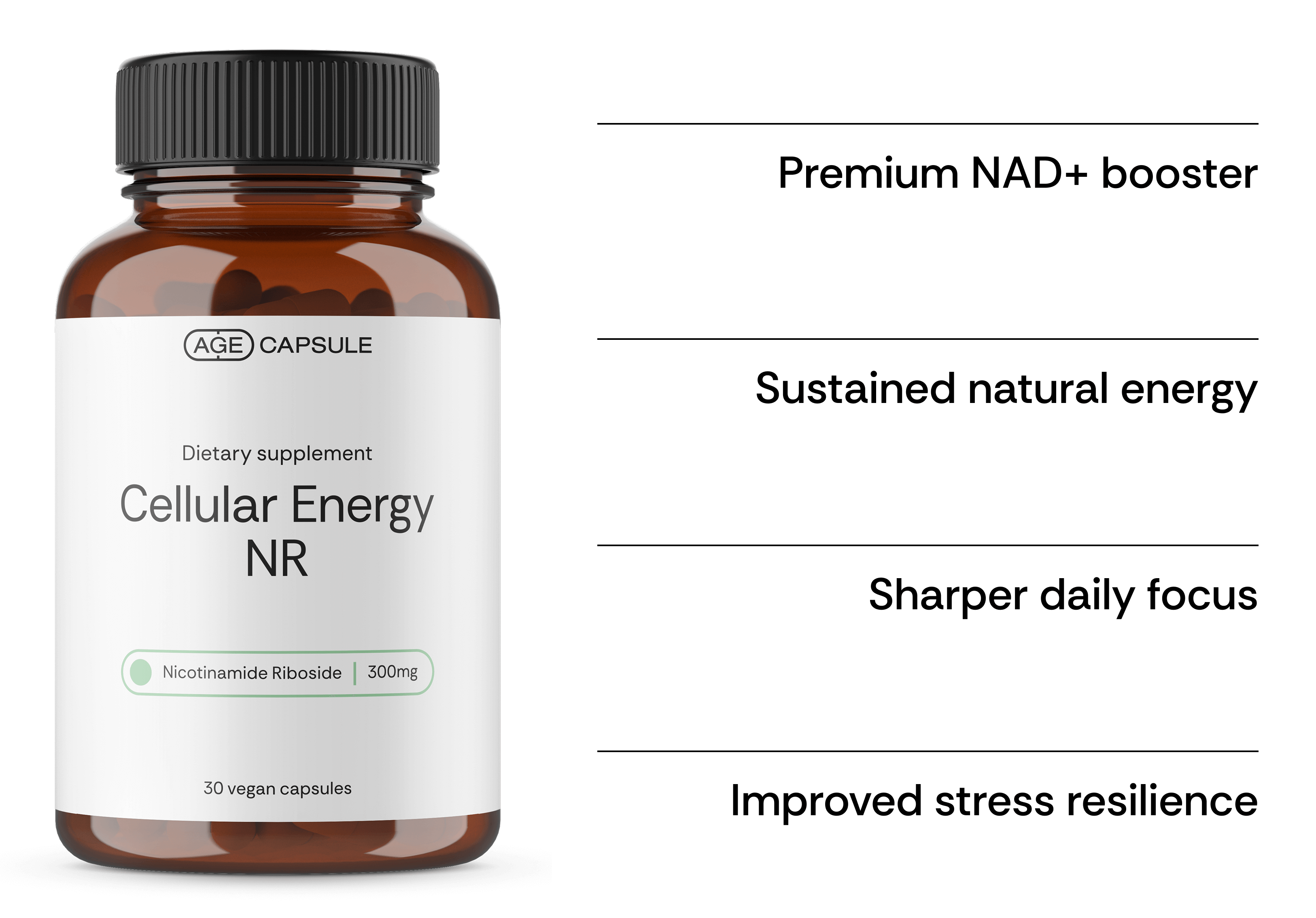 Age Capsule delivers a clinically effective dose of pure Nicotinamide Riboside (NR), to boost your body's essential NAD+levels for enhanced energy, focus, long-term cellular health, and healthy aging.